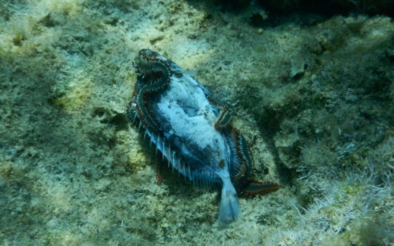 Tornando alle specie aliene e termofile concludiamo la rassegna fotografica con la segnalazione di due specie non gradite provenienti dal Mar Rosso il Pesce palla ( Turquigener flavimaculosus ) e soprattutto il Pesce Scorpione (Pterois miles) che segnalato pochi anni fa nel Mediterraneo orientale e recentemente fotografato in Sicilia ( Oasi di Vendicari) , stà rapidamente invadendo le aree più calde del Mare Nostrum.